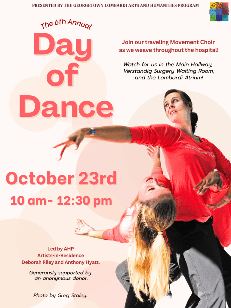 The Day of Dance returns to MedStar Georgetown University Hospital (MGUH) on Thursday, October 23rd! This exciting and inspiring event features a Movement Choir of dancers and musicians that travel throughout MGUH bringing joy to everyone they encounter.